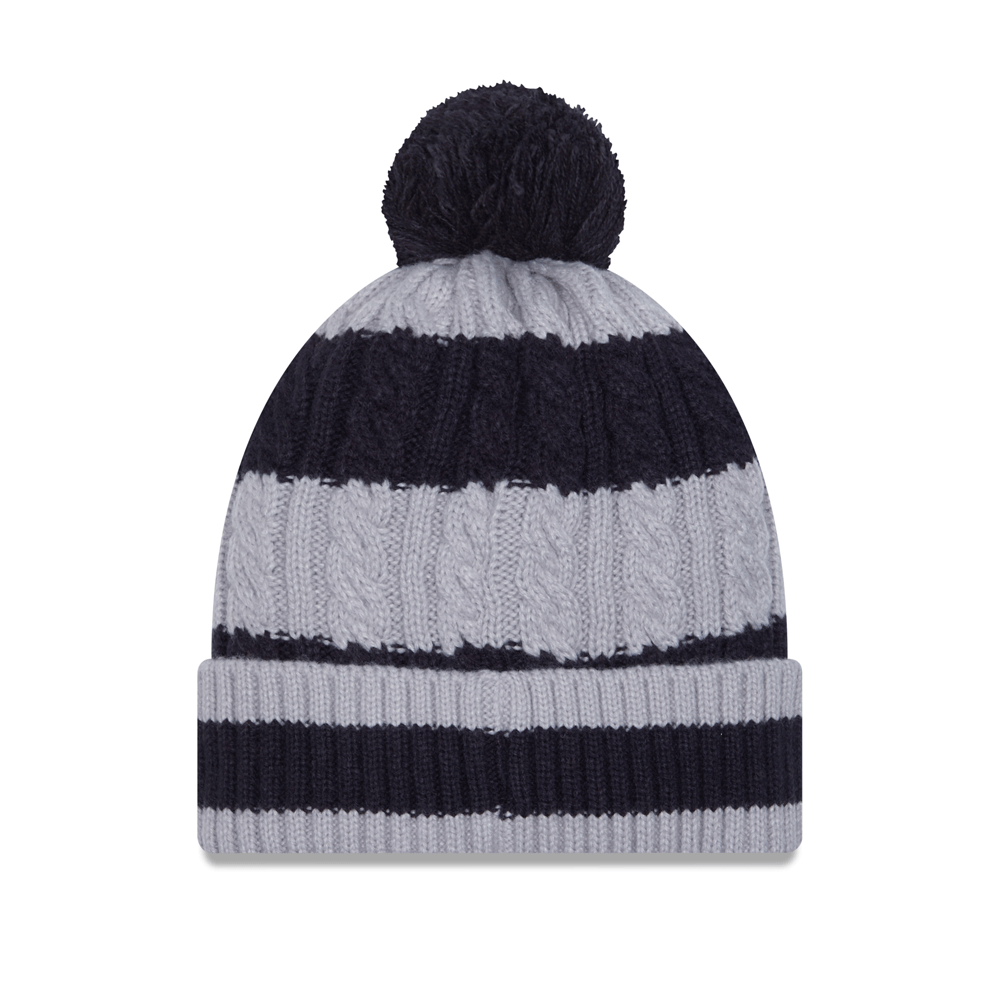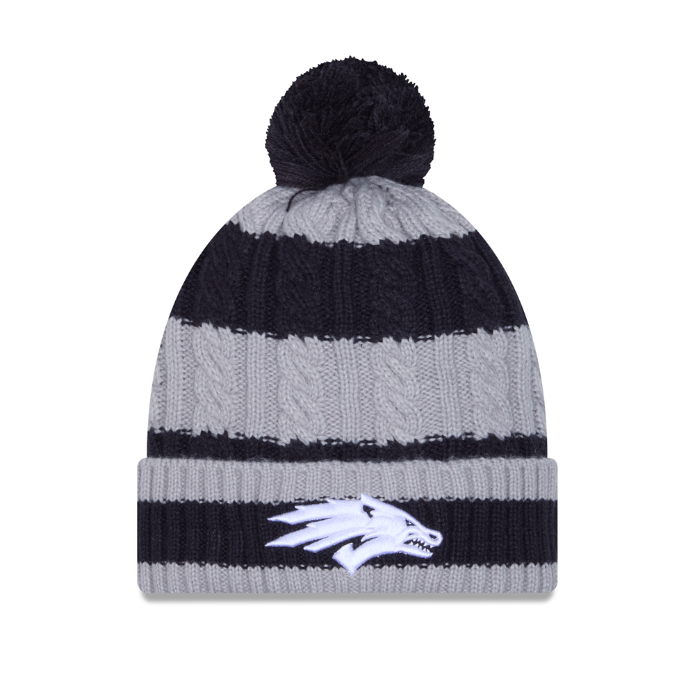 Represent the Wolf Pack with the New Era Braided Knit! This knit beanie features a navy and grey striped pattern, a Sport Wolf logo placed on the cuff, and a navy pom up top - Perfect for chilly games!