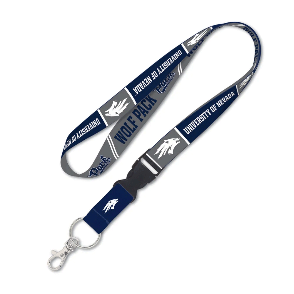 Keep the Wolf Pack with you with the Nevada Color Block Lanyard! This detachable 24" lanyard features primary Wolf Pack and Script Pack logos as well as Wolf Pack and University of Nevada wordmark logos. Go Pack!