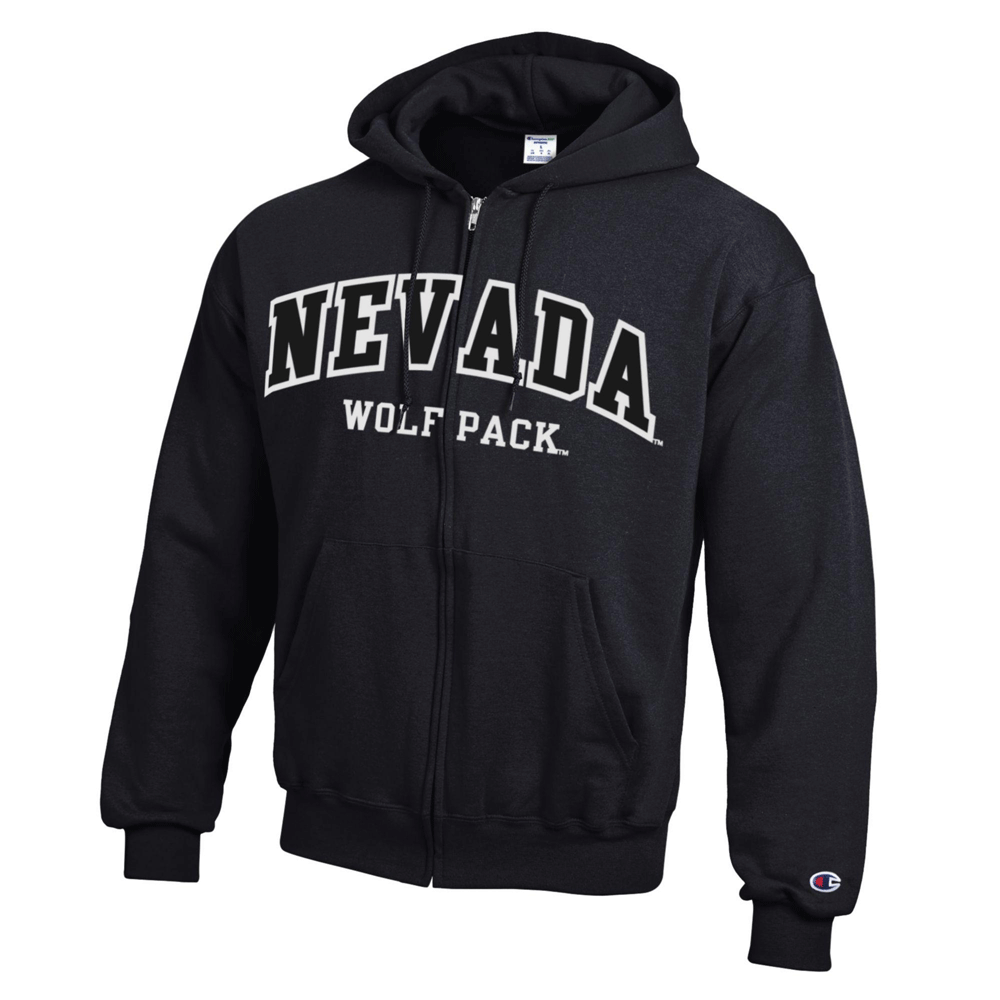 Stay comfortable and warm while representing the Wolf Pack with the Champion Full Zip Hoodie! This men's full zip sweatshirt is Champion brand, is made of their famous 50% cotton / 50% polyester powerblend fleece material, and features an embroidered design proudly showcasing an arched "Nevada" wordmark along with "Wolf Pack" underneath. Available in navy, grey, or black - Go Pack!