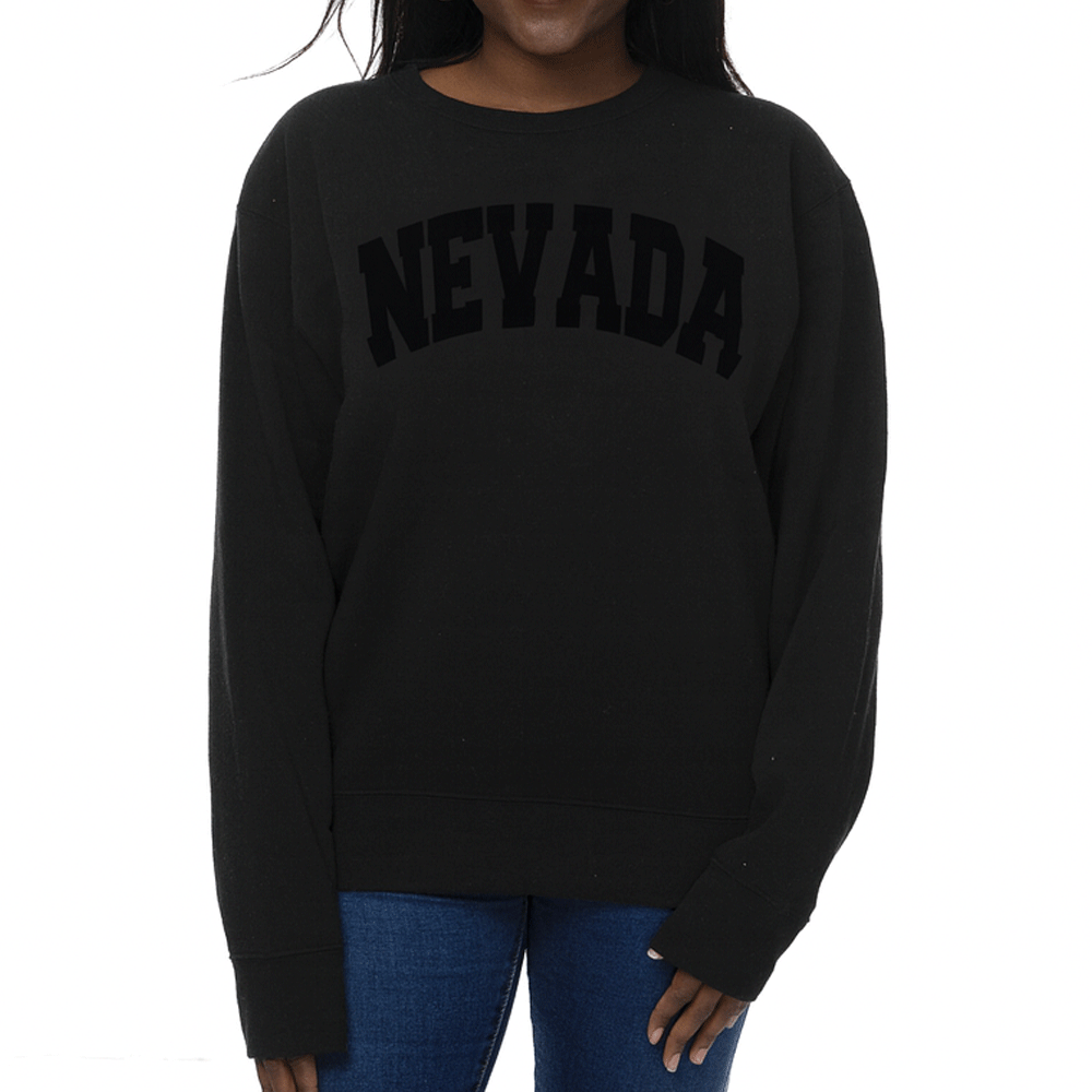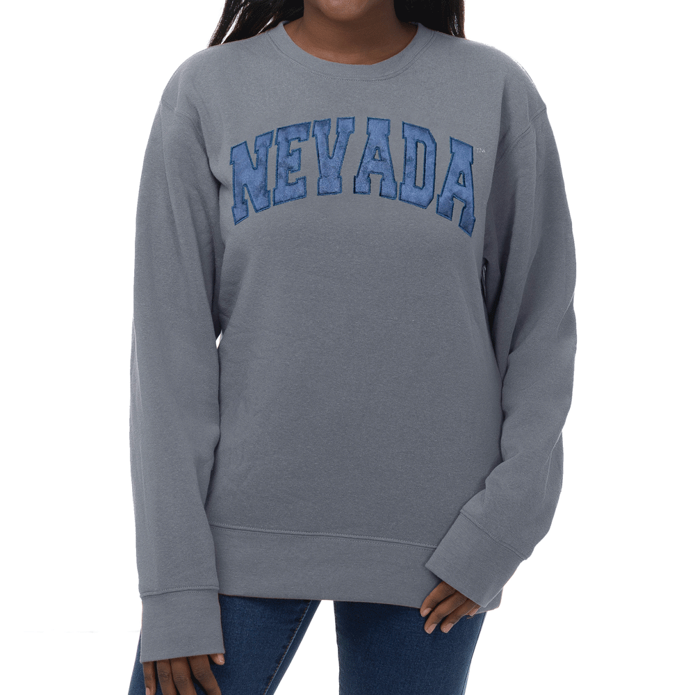 Represent the Wolf Pack in comfort and style with the Satin Crew! Available navy, grey, or black; this comfy women's crewneck sweatshirt is made of a 76% cotton/24% polyester blend and features a high quality embroidered design up front - proudly displaying the word "Nevada" in satin collegiate block lettering. Go Pack!