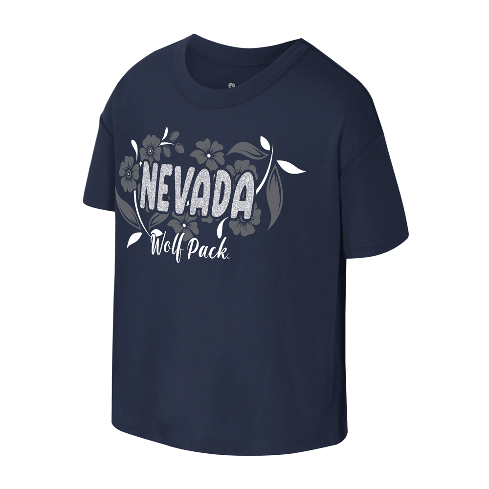 Dress your tiny Wolf Pack fan with the Toddler Grace Tee! This toddler girls' top is made of a comfortable polyester / rayon blend and features a screenprinted design proudly showcasing a floral design along with "Nevada" overlaid with silver glitter, and "Wolf Pack" underneath in a script font. Perfect for game day!