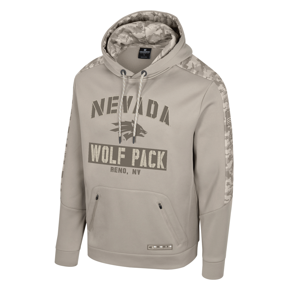 Represent the Wolf Pack while supporting the troops with the Battalion Hoodie! This comfortable, sand colored, men's hoodie is made of comfortable polyester blend and features a digital camp pattern on the sleeves and hood lining, as well as embroidered details proudly showcasing an arched "Nevada" wordmark, a Sport Wolf logo, a "Wolf Pack" wordmark stencil, and "Reno, NV" underneath. Go Pack!