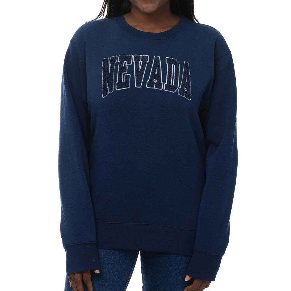 Represent the Wolf Pack in comfort and style with the Chenille Sport Crew! This women's crewneck sweatshirt is made of a 76% cotton / 23% polyester / 1% spandex blend and features an embroidered chenille design proudly showcasing a tonal navy "Nevada" arched wordmark, outlined in white. Perfect for gameday or every day - Go Pack!