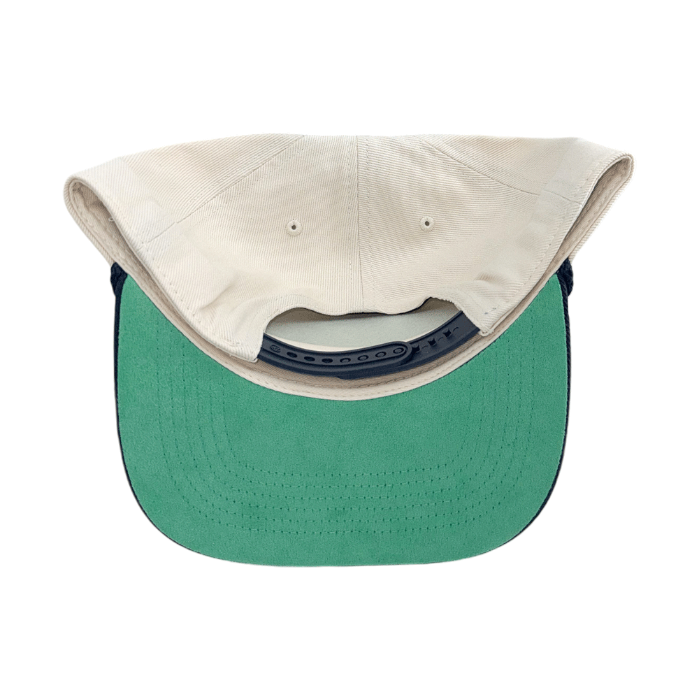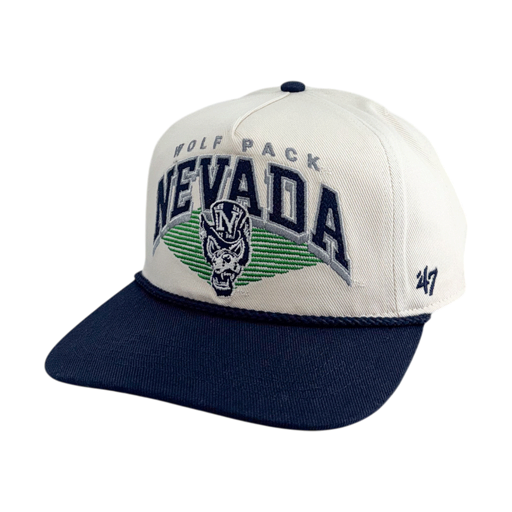 Look great and represent the Wolf Pack with the Pomona Rope Hitch hat! This adjustable A-frame style hat is ivory with a navy brim / green undervisor and features an embroidered design proudly showcasing a arched and textured "Nevada" wordmark, along with "Wolf Pack" in silver and a Throwback Top Hat Wolf logo atop a green field pattern. Perfectly retro and perfect for you - Go Pack!