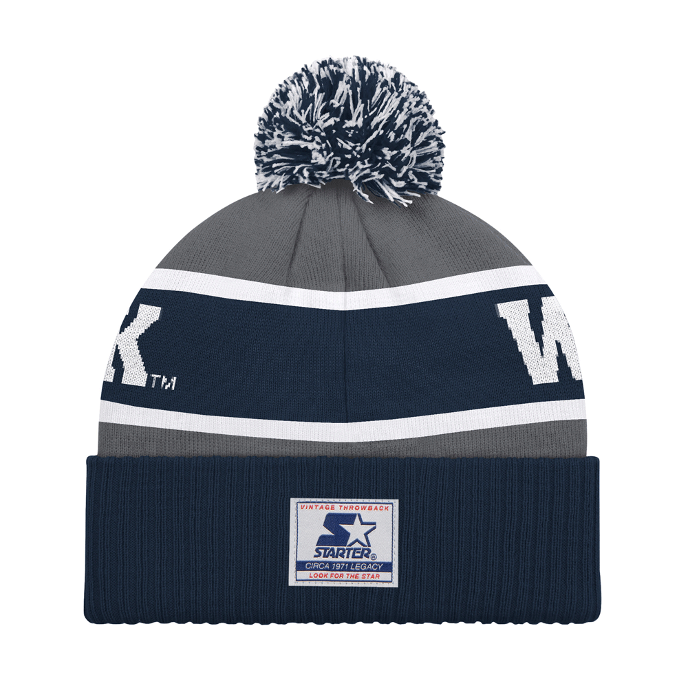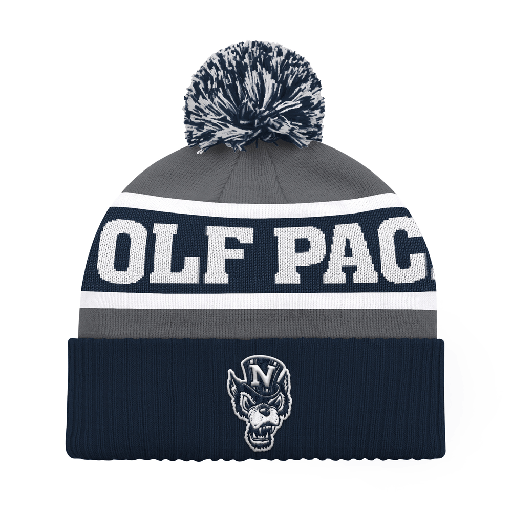 Stay warm and represent the Wolf Pack with the Starter Legacy Beanie! This knit beanie features a "Wolf Pack" wordmark on the grey, white, and navy striped body, along with an embroidered Top Hat Wolf logo atop the navy cuff. This beanie also includes a white and navy pom up top, which can be easily removed. Go Pack!