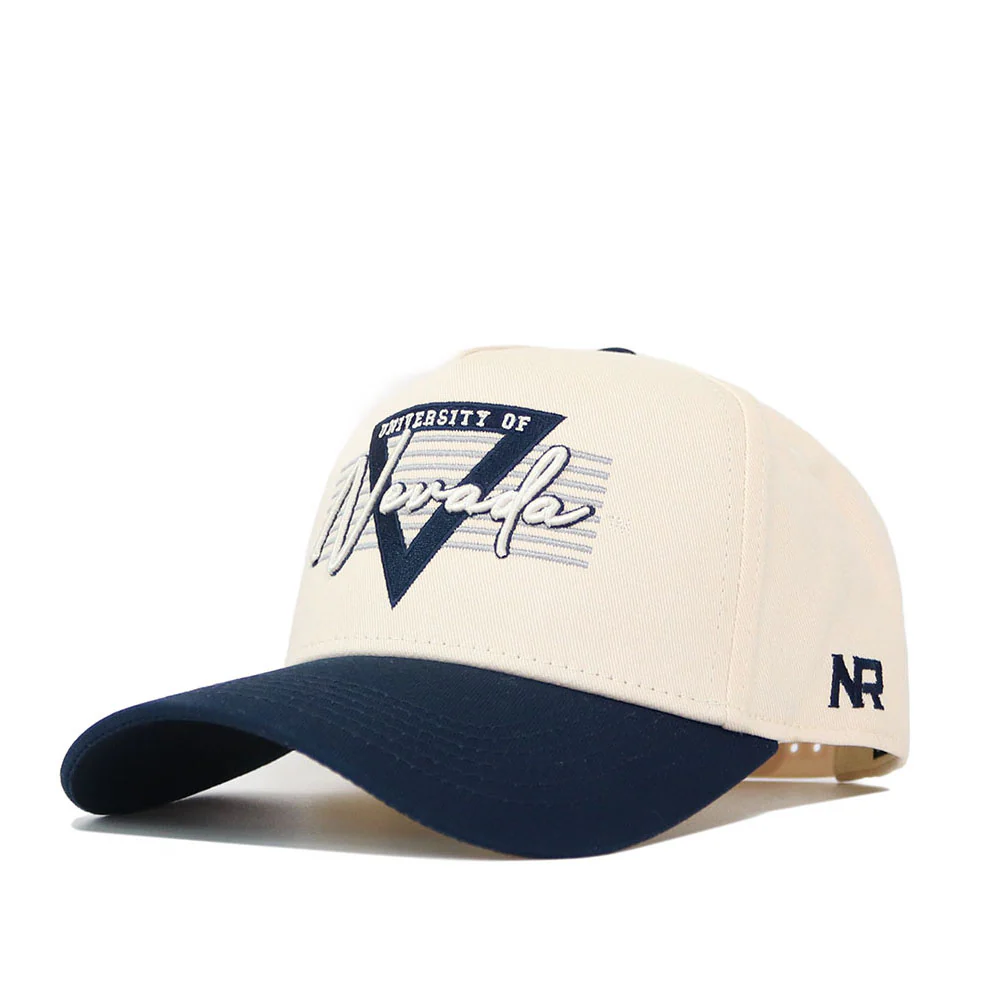 Show off your Wolf Pack pride in style with the Triangle Game hat! This ivory and navy colored hat is made of high quality cotton and features an adjustable snap back as well as embroidered details proudly showcasing a stylized "University of Nevada" design atop a navy triangle, along with a "No Rivals" logo on the side. Go Pack!