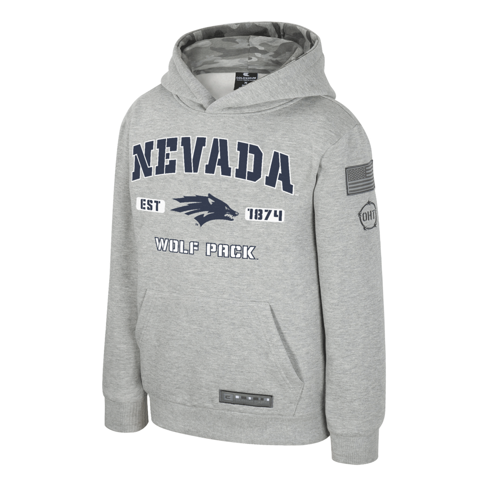 Let your young Wolf Pack fan represent in style with the Youth Platoon Pullover! This youth sized hoodie is made of a comfortable cotton / polyester and features printed details proudly featuring an arched "Nevada" wordmark paired with a navy Sport Wolf logo, "EST. 1874", and "Wolf Pack" underneath. The sleeve also features a rubber American Flag patch and an OHT logo. Go Pack!